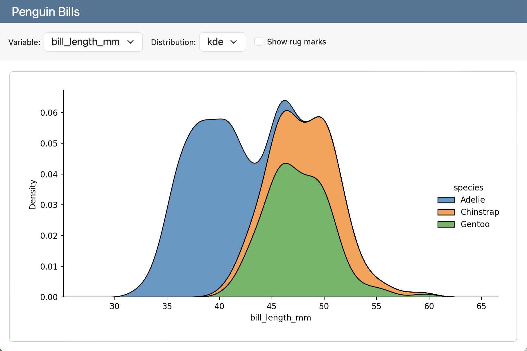 A screenshot of a Penguin Bills card. The card toolbar contains two dropdown menus, one for Variable and one for Distribution and a checkbox to show rugmarks. Below, a plot shows a histogram of bill_length_mm colored by species.